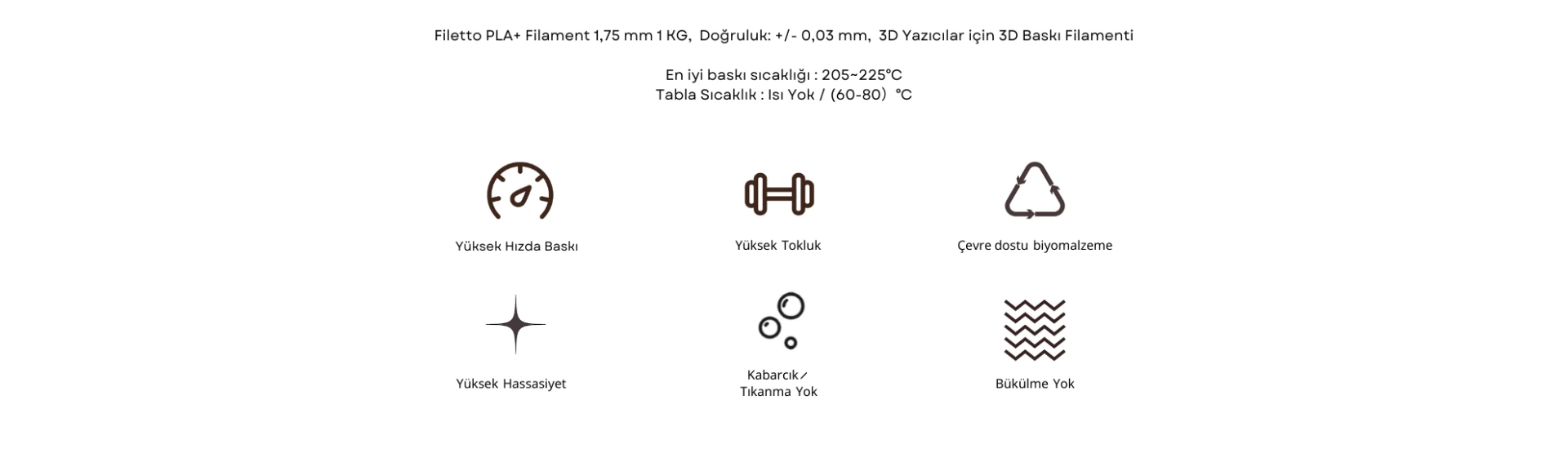 Baskı Kolaylığı PLA+, PLA'nın geliştirilmiş bir versiyonudur. Yüksek mukavemet ve tokluğa sahiptir. Kırılması kolay değildir. Düşük büzülme özelliğine sahiptir. Deformasyon ve çatlama yok, yüksek baskı hassasiyeti mevcuttur. Bitkisel kaynaklardan elde edilen nişasta hammaddeleri ile üretilmiştir, iç mekan baskıları için idealdir.